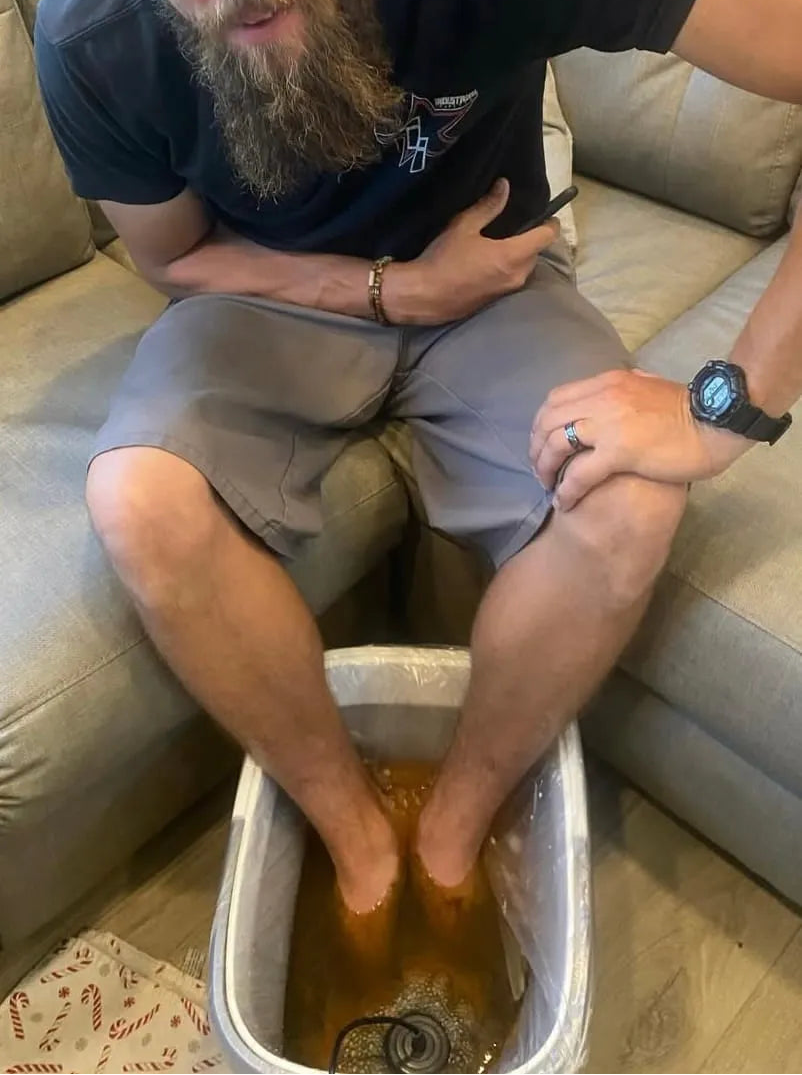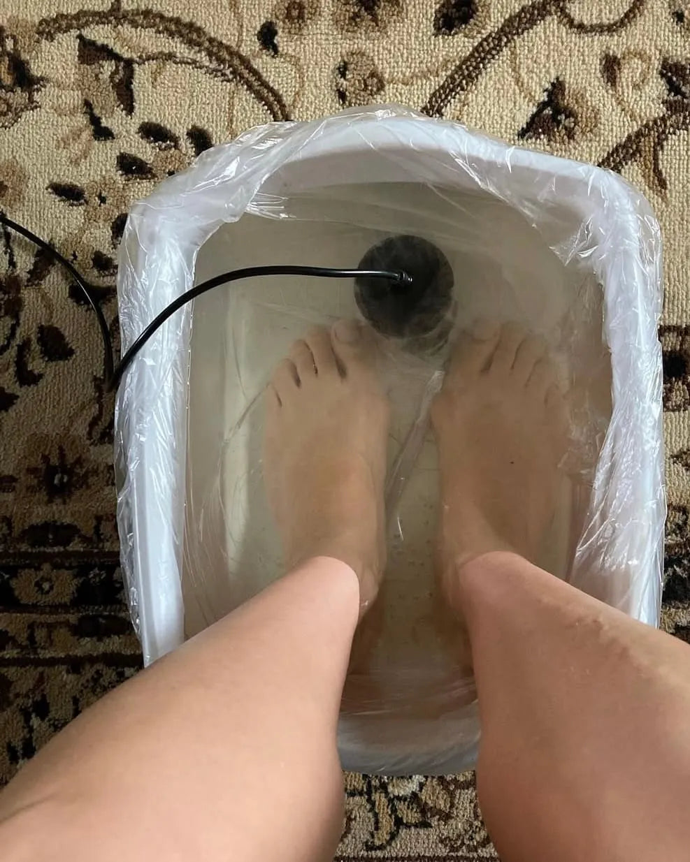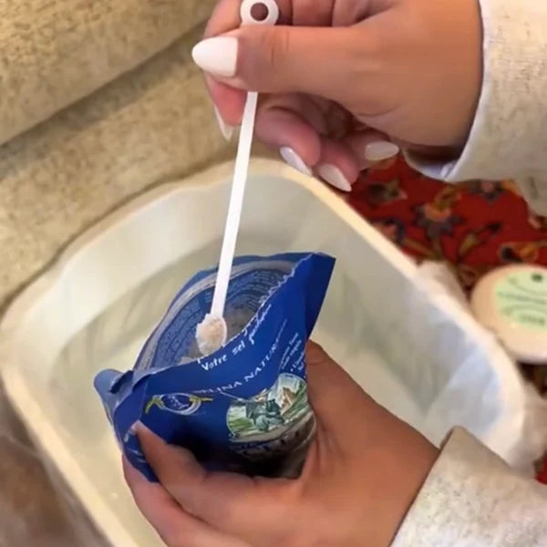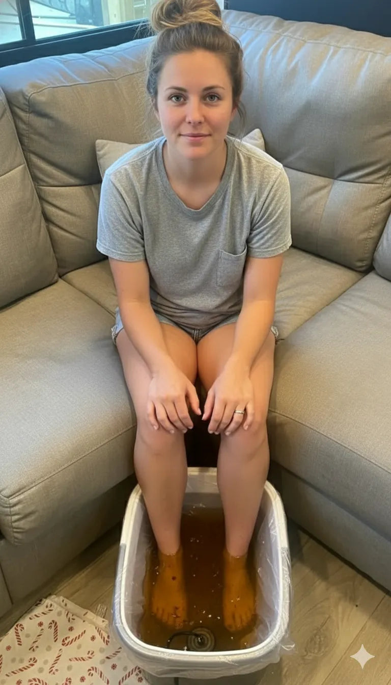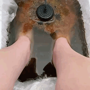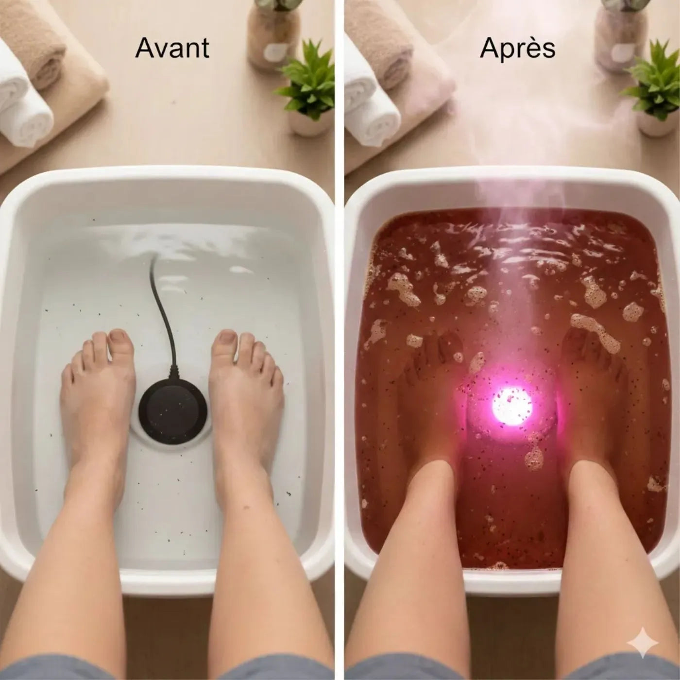 Remplir la bassine d’eau chaude, ajouter du sel si nécessaire, plonger les pieds et laisser agir 30 minutes.