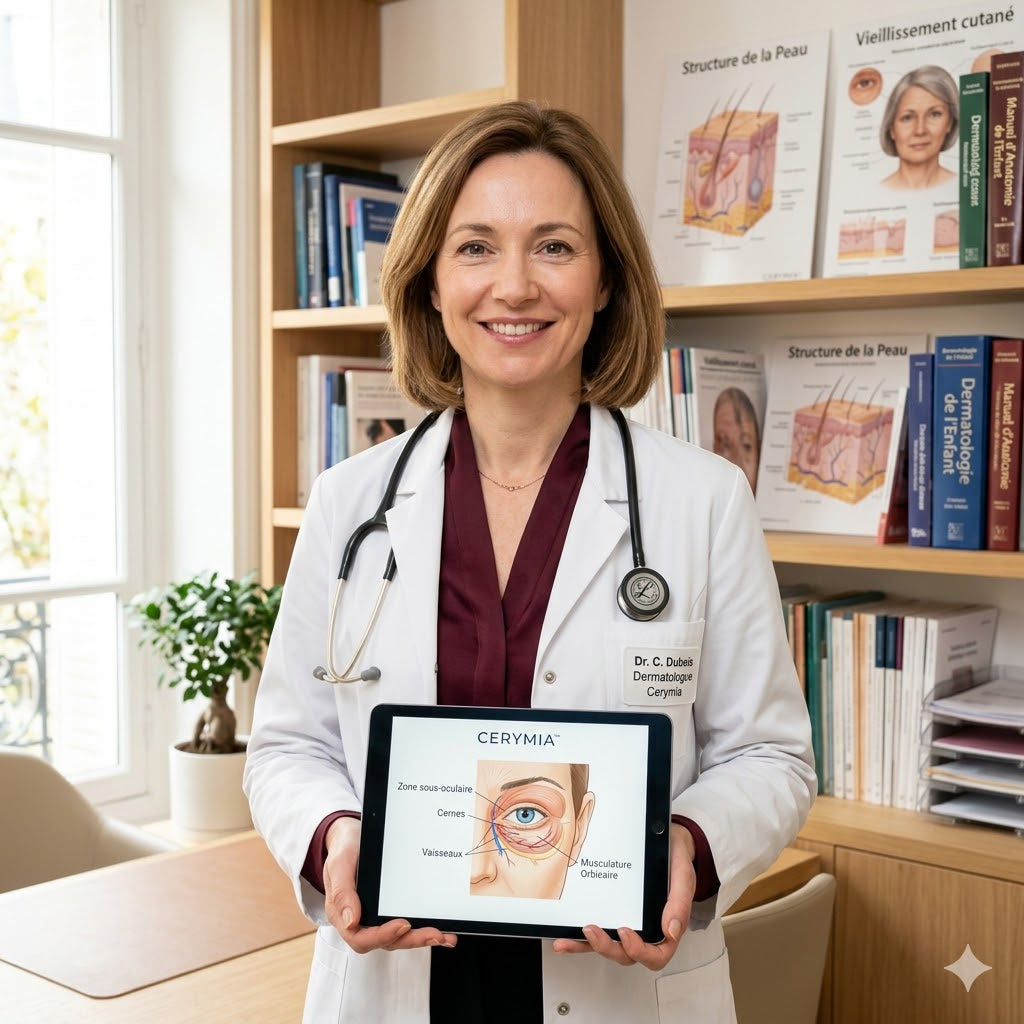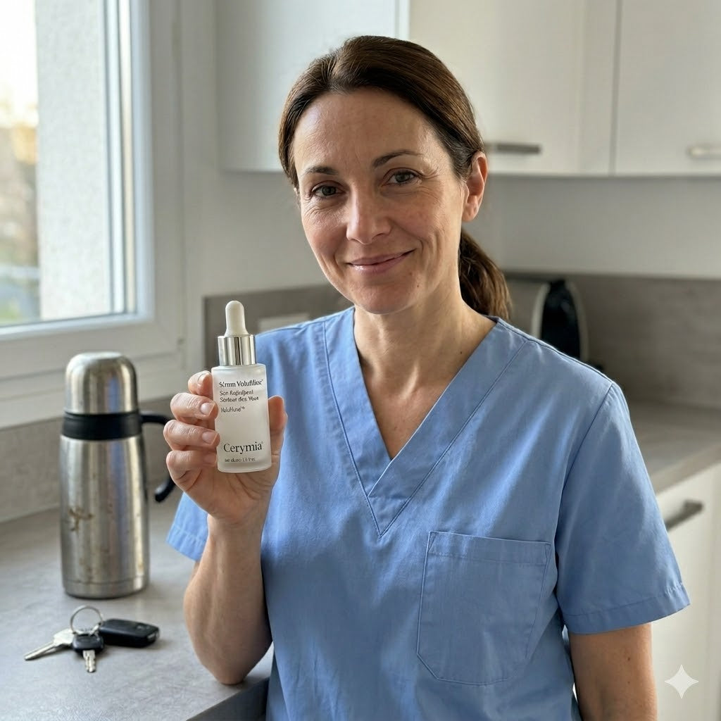 "Dans mon cabinet, je reçois chaque semaine des patientes qui ont tout essayé pour se débarrasser de leurs cernes : des crèmes contour des yeux en parapharmacie aux sérums premium à 80€, en passant par les patchs et le maquillage correcteur — sans jamais obtenir de résultat durable. La plupart sont convaincues qu'elles manquent de sommeil ou d'hydratation. En réalité, dans la majorité des cas, le vrai responsable est la perte de volume sous-cutané liée au vieillissement — un creux structurel que les crèmes de surface ne peuvent tout simplement pas combler. Ce que j'apprécie avec Cerymia™, c'est que l'approche est scientifiquement cohérente : la Volufiline™ stimule le volume naturel des tissus adipeux sous la peau, les peptides de collagène renforcent la structure cutanée, et l'acide hyaluronique basse densité hydrate sans alourdir. On ne masque pas les cernes — on traite la cause. La formule est sans injection, sans effet secondaire, et convient aux peaux sensibilisées par des années de soins inadaptés. C'est exactement ce que je recommande à mes patientes qui ont épuisé les solutions classiques sans résultat."