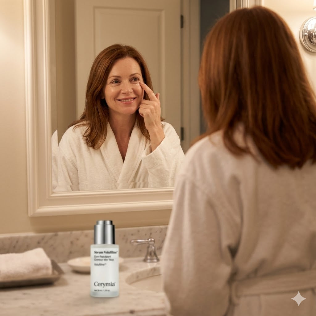 Imaginez vous regarder dans le miroir et voir un regard reposé, lumineux — sans avoir rien appliqué d'autre que votre sérum. Plus de creux visible sous les yeux. Plus de teint fatigué. Plus de "tu as l'air crevée" au bureau. C'est ce que décrivent nos clientes après 3 à 4 semaines d'utilisation : une zone sous les yeux visiblement repulpée, un regard qui paraît plus jeune, plus ouvert. Certaines ont annulé leur rendez-vous chez le médecin esthétique. D'autres ont rangé leur anti-cernes dans un tiroir. Le changement n'est pas spectaculaire du jour au lendemain — il est progressif, naturel, et c'est exactement pour ça que l'entourage remarque sans comprendre. On ne vous dira pas "tu as fait quelque chose". On vous dira "tu as l'air en forme en ce moment".